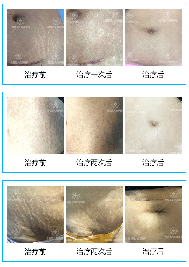 昆明昆大疤痕医院采用PLASMA闪耀离子束祛妊娠纹、宝石之光祛妊娠纹、新辉煌360至尊祛纹系统联合修复妊娠纹,以刺激胶原蛋白、弹性蛋白的合成,重新支撑起之前就被破坏的纤维网,恢复肌肤再生长。